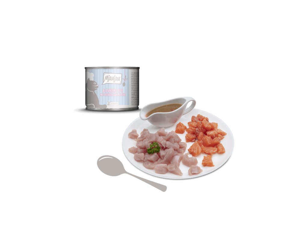 Mjamjam – Morčacie mäso s lososom a lososovým olejom je lahodná kombinácia jemného morčacieho mäsa (50 %) a čerstvého lososa (20 %). Receptúra doplnená o minerály a lososový olej poskytuje mačkám vyvážený zdroj bielkovín, taurínu a esenciálnych živín.