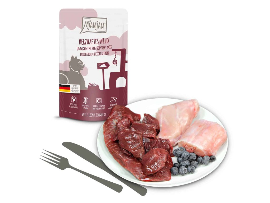 MjAMjAM – Divina s králičím mäsom a čučoriedkami je prémiová konzerva pre mačky s vysokým podielom čerstvého mäsa (69 %). Kombinácia diviny a králičích vnútorností doplnená o šťavnaté čučoriedky prináša jedinečný chuťový zážitok a zároveň dodáva telu dôležité vitamíny a minerály.