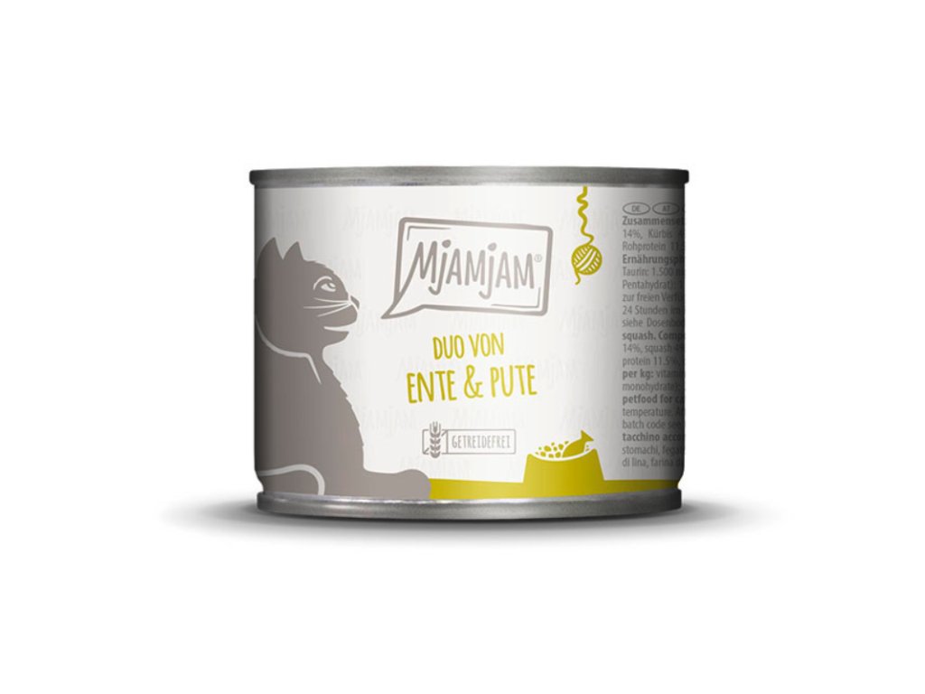 MjAMjAM DUO jemné kačacie a morčacie mäso s dusenou tekvicou je kompletné a výživné krmivo pre mačky. Spája kvalitné mäso so zeleninou bohatou na vlákninu a minerály. Vďaka šetrnému spracovaniu si zachováva prirodzenú chuť a vôňu. Vyrobené v Nemecku bez obilnín, lepku a umelých prísad.