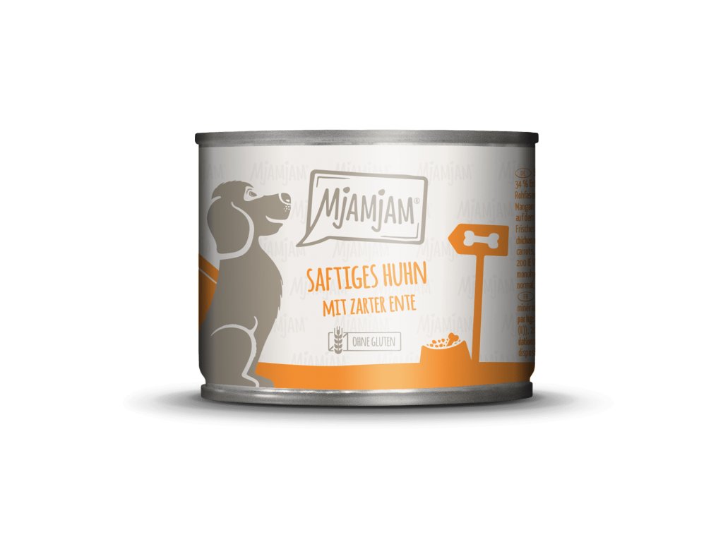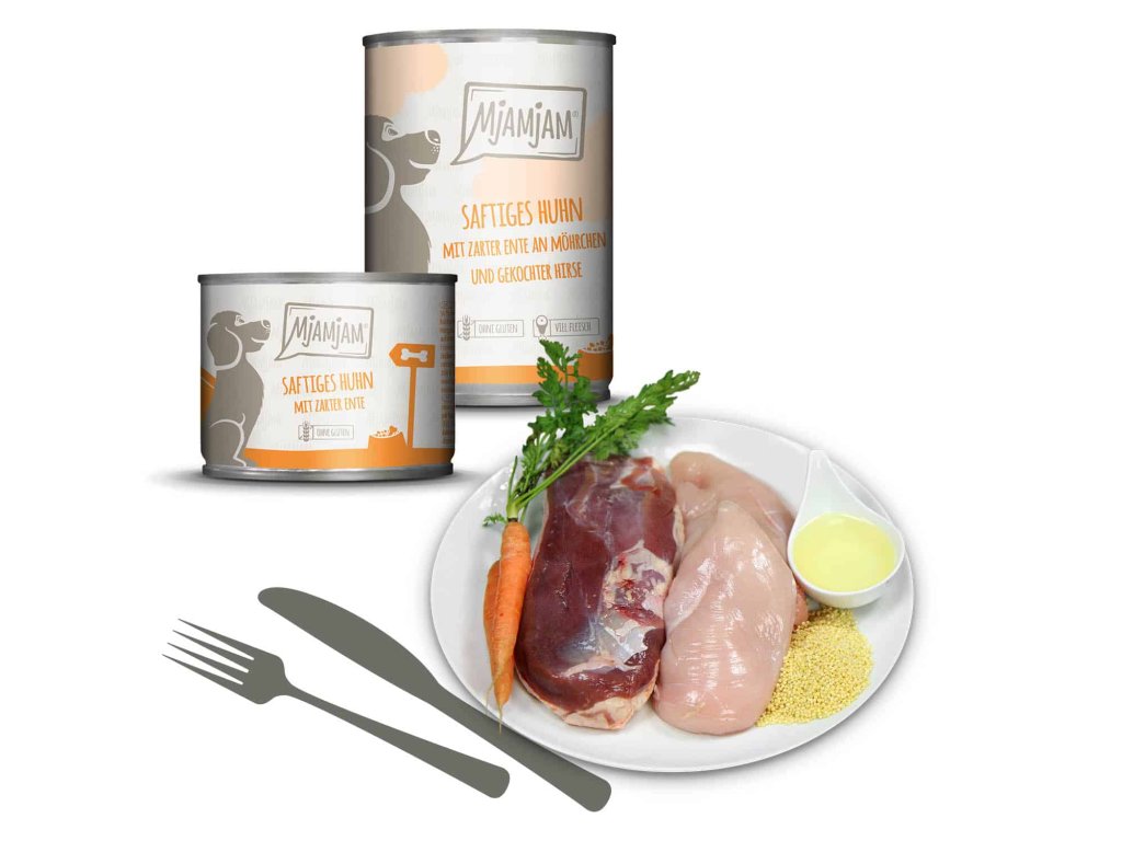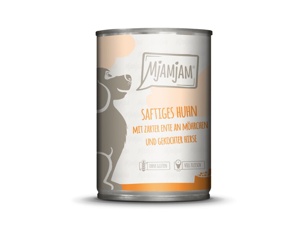 MjAMjAM Kuracie a kačacie mäso s mrkvou a prosom je kompletné mokré krmivo bez obilnín, lepku a laktózy. Kombinácia kvalitného mäsa, vlákniny a zdravých tukov podporuje trávenie, imunitu a vitalitu. Proso je prirodzeným zdrojom energie a minerálov. Neobsahuje karagénan, umelé prísady ani konzervačné látky. Vyrobené v Nemecku z čerstvých surovín pod veterinárnym dohľadom.