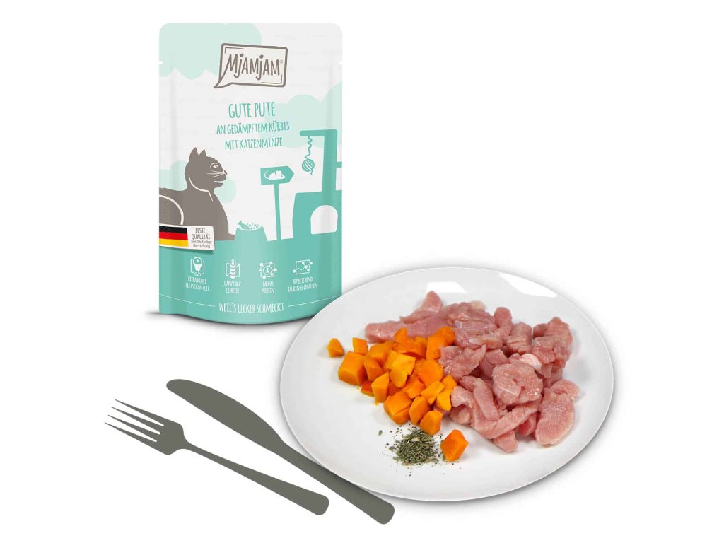 Šetrne varená morčacia konzerva pre mačky s tekvicou a bylinkou kocúrnik. Mjamjam – mokré krmivo s vysokým obsahom mäsa, bez obilnín a chémie, vyrobené z kvalitných surovín z regionálnych fariem v Nemecku.