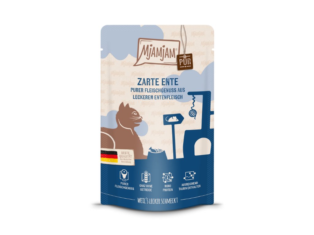 Mjamjam Jemné kačacie mäso je kvalitné mokré krmivo pre mačky s vysokým obsahom čerstvého mäsa a vnútorností. Jednodruhová receptúra z kačacieho mäsa poskytuje prirodzené bielkoviny, tuky a dôležité živiny pre zdravé trávenie a vitalitu. Produkt neobsahuje obilniny, lepok, laktózu ani umelé konzervačné látky – ideálny aj pre mačky s citlivým trávením.