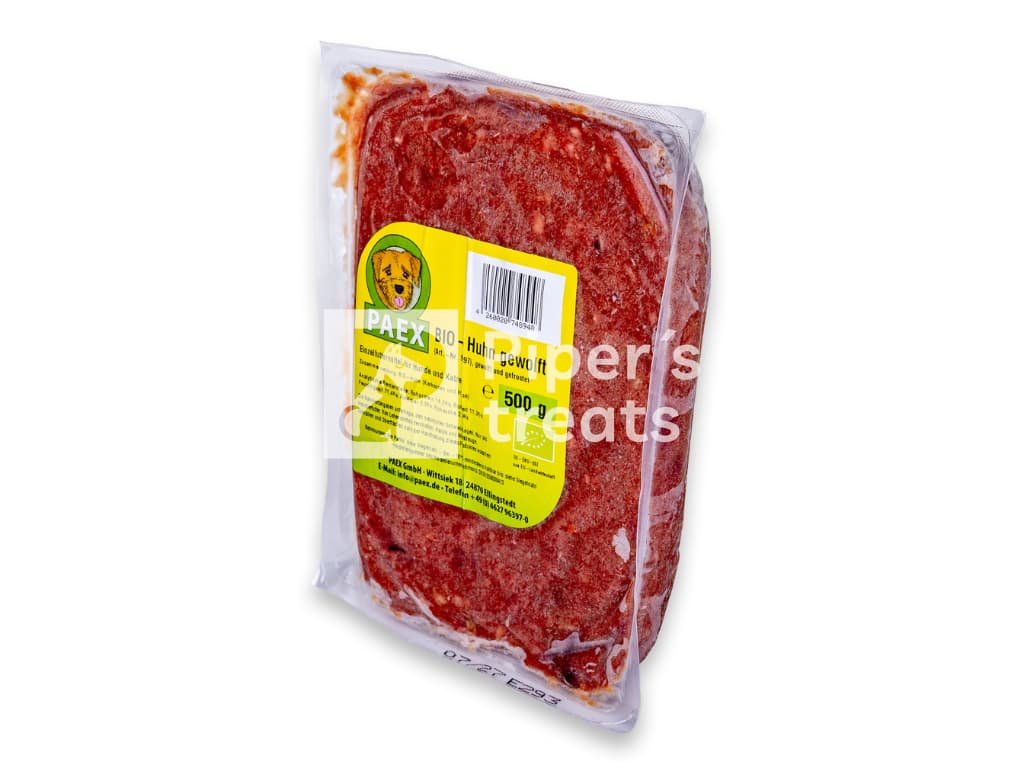 PAEX – BIO Kurací mix je jemne mleté kuracie mäso v certifikovanej BIO kvalite. Pochádza z ekologických chovov bez antibiotík, hormónov a chemických prísad. Vysoký obsah kvalitných bielkovín a prírodných minerálov robí z tohto produktu výživnú a dobre stráviteľnú súčasť BARF menu pre psov a mačky.