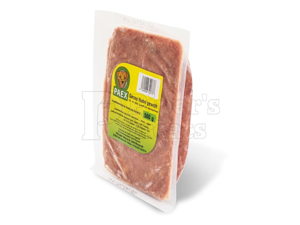 PAEX Celé kura mleté je jednodruhová mrazená surová zmes vhodná pre psov a mačky. Obsahuje celé kura vrátane kuracej pečene, srdca a žalúdkov, jemne zomleté pre jednoduché podávanie a optimálnu stráviteľnosť. Ide o mleté kuracie mäso pre psov a mačky, ktoré je ideálne ako základ BARF diéty.