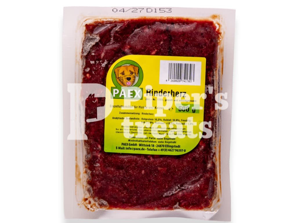 PAEX – Hovädzie srdce je jednosurovinové jemne mleté hovädzie mäso bez aditív a konzervantov. Predstavuje hodnotnú špecifickú časť hovädzieho mäsa s vysokým obsahom živočíšnych bielkovín, železa a taurínu, ktoré podporujú zdravú kondíciu psov aj mačiek.