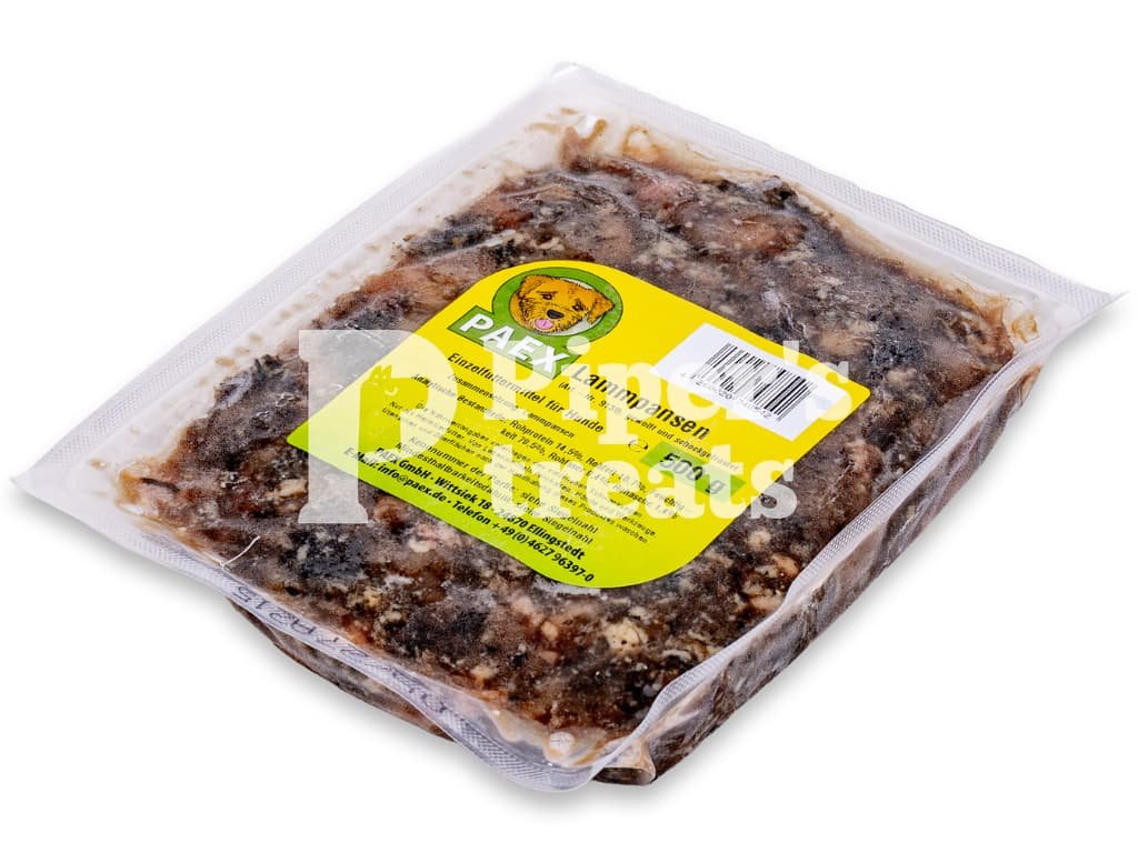 PAEX – Jahňacie držky mleté sú výživné BARF krmivo pre psov s vysokým obsahom enzýmov a fermentovanej vlákniny. Jemne mleté a šokovo mrazené držky podporujú zdravé trávenie, črevnú mikroflóru aj imunitu a sú ideálne pre citlivé psy, šteňatá a seniorov alebo pri prechode na BARF.