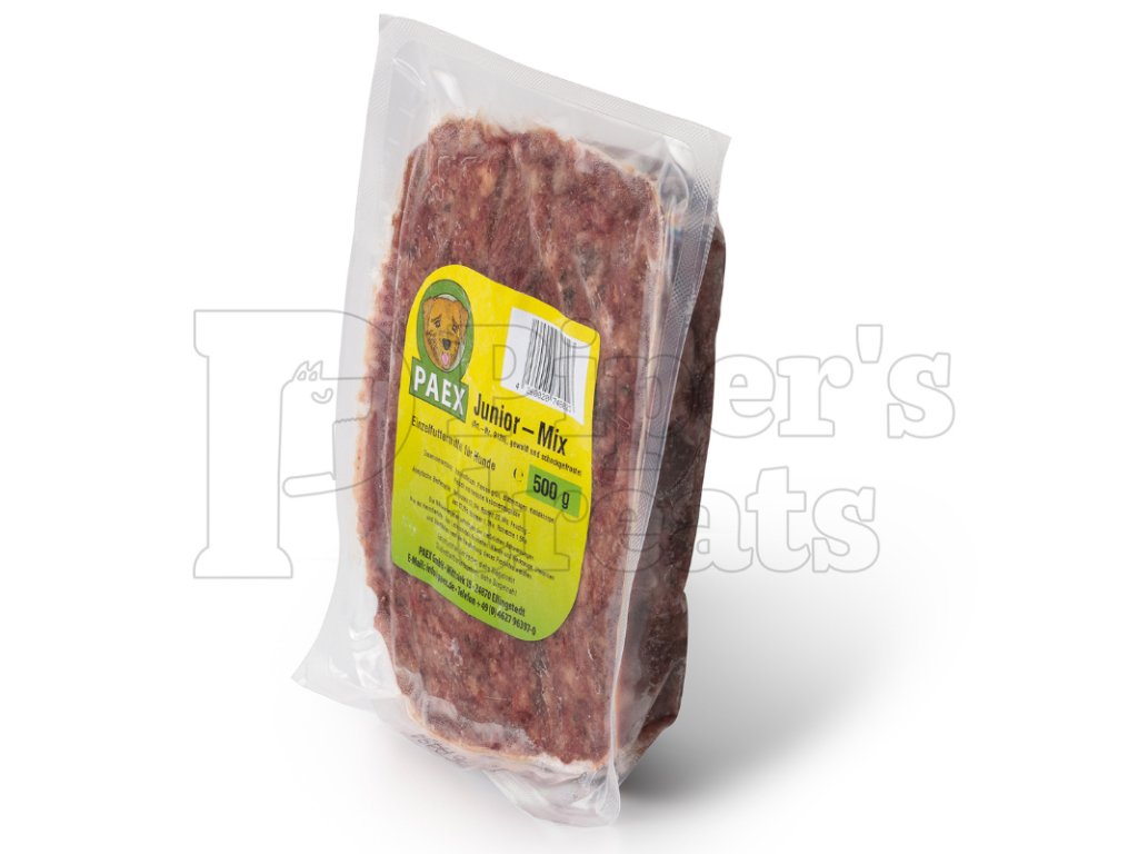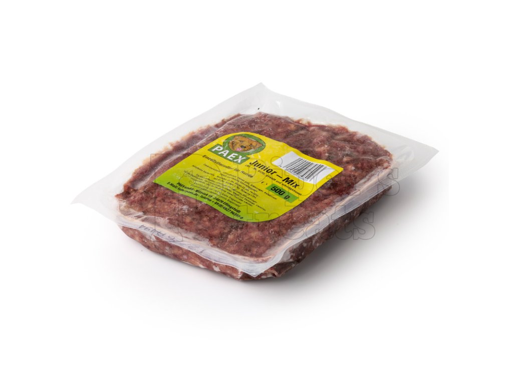 PAEX Junior MIX je špeciálne navrhnutý BARF pre šteňatá všetkých plemien. Obsahuje hovädzie mäso, zelené držky, žalúdok a teľacie chrupavky – zdroje bielkovín, tuku, vápnika a kolagénu. Podporuje zdravý rast kostí, vývoj svalov a imunitu. Vďaka jemnej konzistencii je vhodný aj pre malé plemená a šteňatá s citlivým trávením.