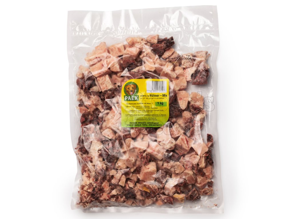 PAEX Kocky Kurací MIX sú porciované mrazené kocky z kuracích pŕs, krkov, pečene, sŕdc a žalúdkov. Spojenie svaloviny a vnútorností tvorí plnohodnotný kurací BARF základ vhodný pre psov aj mačky všetkých plemien.
