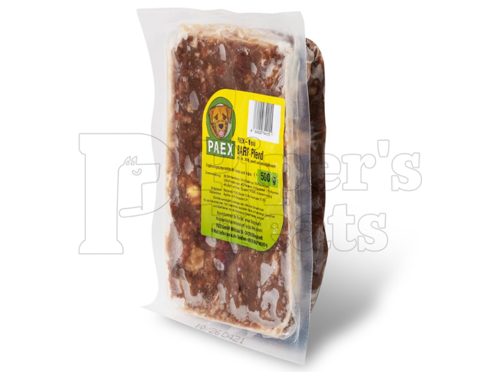 PAEX – Konské BARF Menu je prémiová receptúra určená na každodenné kŕmenie psov a mačiek. Spojuje konské mäso, pľúca, žalúdok, hrudnú kosť, srdce a pečeň s mrkvou, jablkami, hruškami, ľanovým olejom a bylinnou zmesou. Konské mäso patrí medzi najlepšie tolerované zdroje bielkovín – ideálne pre alergikov aj citlivé zvieratá.