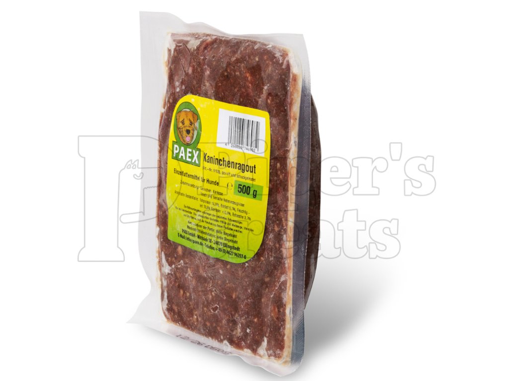 PAEX – Králičie ragú je výživné mleté surové krmivo vyrobené z celého králika (bez hlavy, srsti a labiek), s prirodzeným obsahom kostí a chrupaviek. Táto kombinácia poskytuje optimálny pomer minerálov, bielkovín a zdravých tukov, ktoré podporujú silné svaly, trávenie a vitalitu.