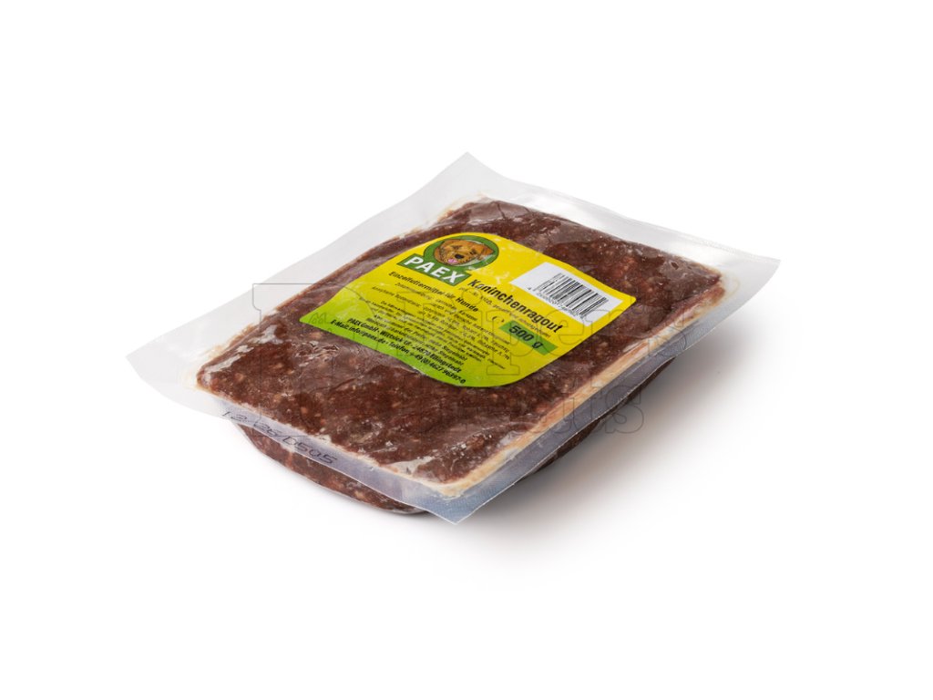 PAEX – Králičie ragú je jemne mleté králičie mäso vrátane kostí a chrupaviek (bez hlavy, srsti a labiek). Hypoalergénne a ľahko stráviteľné BARF krmivo pre psov a mačky – ideálne pre citlivé trávenie, šteniatka, seniorov a každodenné podávanie.