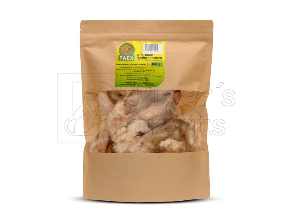 PAEX Králičie uši so srsťou sú 100 % prírodné sušené BARF maškrty pre psov a mačky. Obsahujú kožu aj srsť – prirodzený zdroj vlákniny a tráviacich enzýmov. Bez konzervantov a chémie, ideálne pre citlivé trávenie a čistenie čriev.