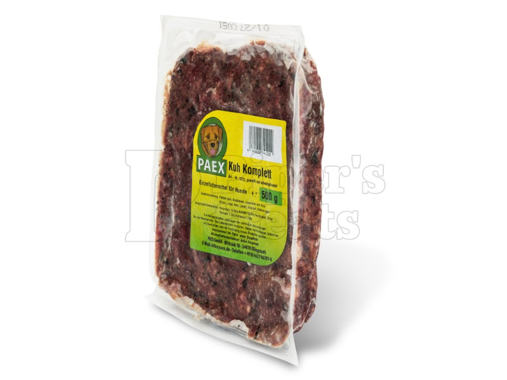 PAEX – Hovädzie KOMPLET je výživovo bohaté kompletné BARF krmivo vytvorené podľa zásad prirodzenej surovej výživy. Obsahuje hovädzie držky, mäso, obličky, pľúca, srdce, pečeň, chrupavku a žalúdok – všetko v jednom balení. Každá porcia poskytuje plnohodnotný zdroj živočíšnych bielkovín, tukov, kolagénu, enzýmov a minerálov potrebných pre silu, energiu a zdravé trávenie.