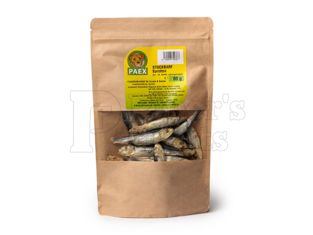 PAEX – Mrazom sušené rybky sú celé šproty sušené lyofilizáciou, ktorá zachováva všetky dôležité živiny, prirodzenú arómu aj chuť čerstvých rýb. Ide o výživnú, energeticky bohatú BARF maškrtu s vysokým obsahom omega-3 mastných kyselín, ktoré podporujú zdravú pokožku, srsť, mozgové funkcie a imunitný systém. Vhodné pre psov aj mačky všetkých plemien.