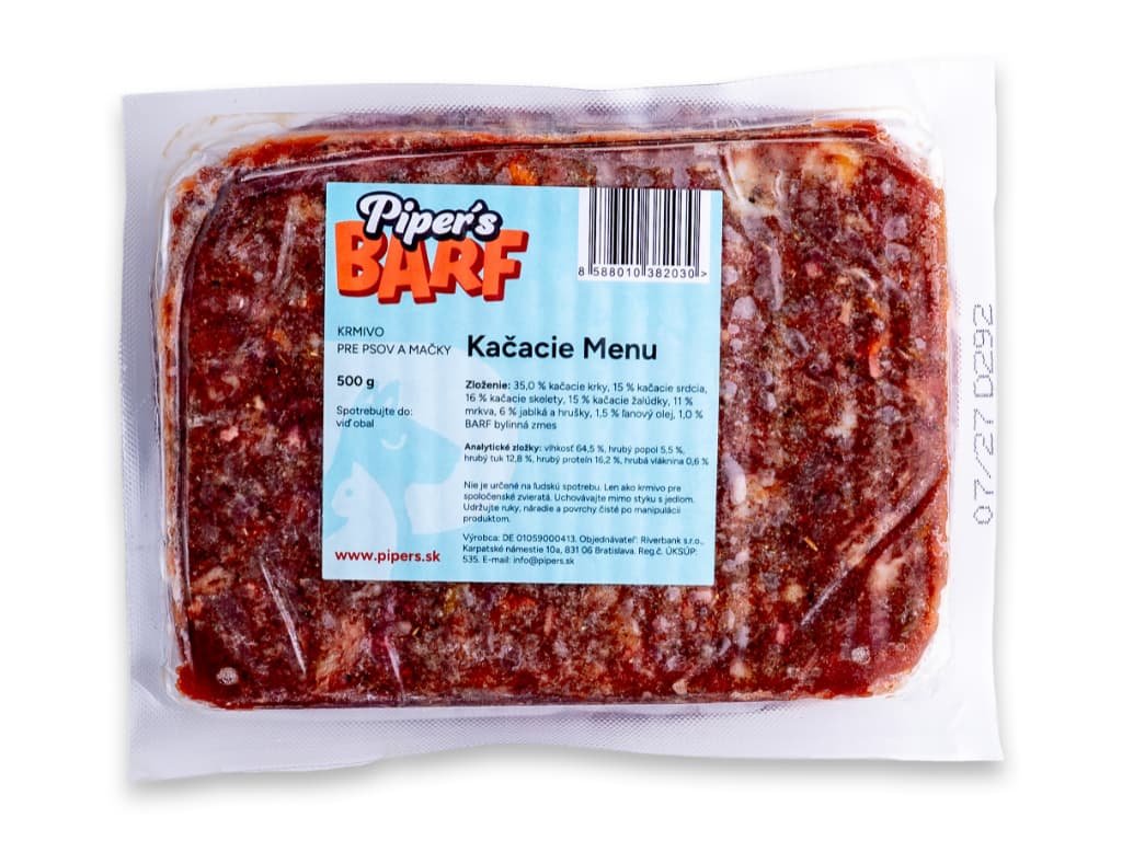 Piper’s BARF – Kačacie Menu je kompletné mleté BARF krmivo pripravené z kačacieho mäsa, vnútorností, kostí, zeleniny a ovocia. Hypoalergénne, výživné a ľahko stráviteľné – vhodné pre psy aj mačky všetkých plemien.