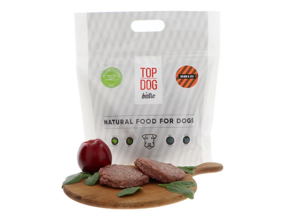 Top Dog Bistro – Salmon and Beef predstavuje vyvážené kompletné BARF menu spájajúce lososa (40 % receptúry) a hovädzie vnútornosti (žalúdok, pľúca, srdce, oblička, pečeň) s doplnkom zeleniny a ovocia. Losos prináša omega-3 mastné kyseliny pre kožu a srsť, hovädzie vnútornosti sú prirodzeným zdrojom železa, vitamínov a enzýmov pre vitalitu a metabolizmus.
